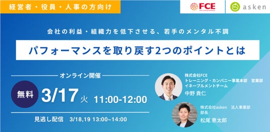 株式会社FCE(東京都新宿区、代表取締役社長:石川淳悦、証券コード:9564)は、 AI食事管理アプリ『あすけん』を開発・運営する株式会社asken(本社: 東京都新宿区、代表取締役社長:中島 洋)と、経営者・人事向けオンライン無料セミナー「会社の利益・組織力を低下させる、若手のメンタル不調。 パフォーマンスを取り戻す2つのポイントとは」を開催いたします。