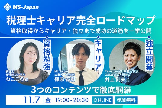 株式会社MS-Japan資格取得・キャリア形成・独立開業を90分で網羅。元戦略コンサル 税理士 ねこころ氏、Takeoffer会計事務所 公認会計士・税理士 井上 剛夫氏らが登壇