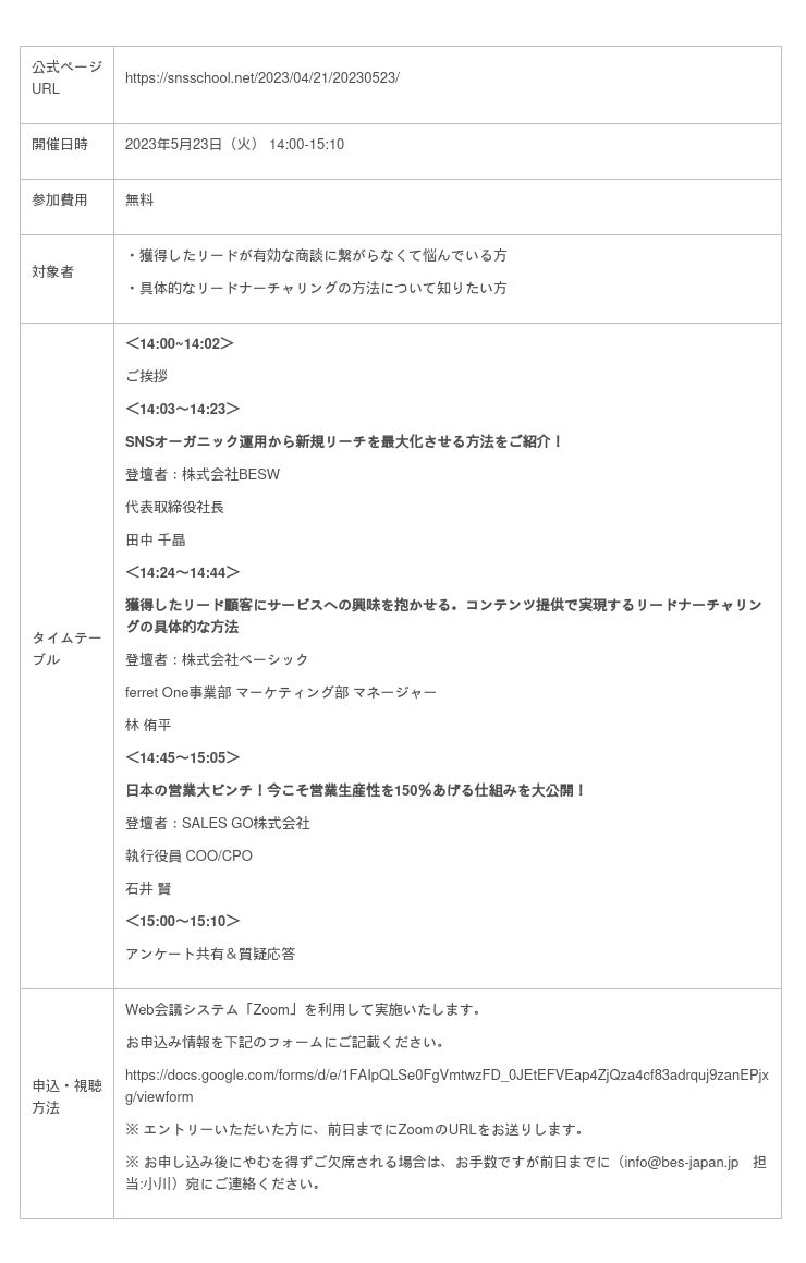 BtoBマーケティングのお困りごとをまるっと解決するサービス『ferret One(フェレットワン)』を運営する株式会社ベーシック(本社:東京都千代田区、代表取締役:秋山勝、以下「当社」)は5/23(火)14時より、株式会社BESW(本社:東京都台東区、代表取締役:田中千晶)が主催する「【BtoB向け】効果的な営業課題解決セミナー」に登壇いたします。