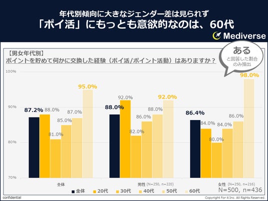 男女年代別に見ると、「ポイ活」を経験したことがあると回答した割合は、男女問わず、すべての年代において8割を超えていた。
