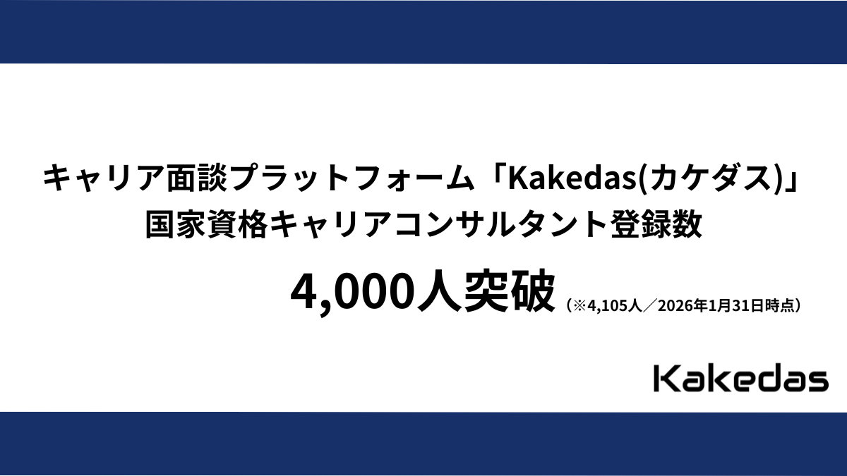 株式会社ジェイック企業向けの教育研修事業と若年層向けの就職支援事業を展開する株式会社ジェイックの子会社である、国内最大級のキャリア面談プラットフォーム「Kakedas(カケダス)」を運営する株式会社Kakedasは、この度、キャリア面談プラットフォーム「Kakedas(カケダス)」に登録する、国家資格キャリアコンサルタントが4,000人を突破したことを発表します。(※1)