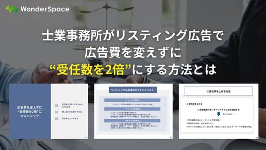 株式会社WonderSpace(本社:東京都港区、代表取締役社長:山本 尚宏)は、『【広告費を変えずに“受任数を2倍”にするロジックやリスティング広告における集客改善施策をご紹介』に関する資料ダウンロードを開始しました。