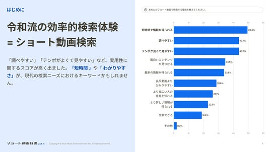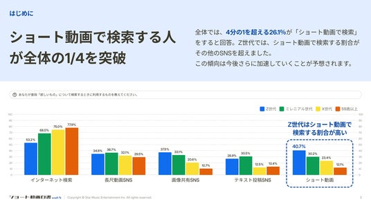 株式会社スターミュージック・エンタテインメント(本社:東京都渋谷区、代表取締役:渡邊祐平、以下「当社」)が運営するStar Creationは、ショート動画の主要4プラットフォームを調査したレポート「ショート動画白書 vol.5 - ショート動画検索時代到来。」を公開します。