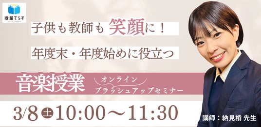 株式会社NIJINが運営する教員向けオンライン研修サイト「授業てらす」は、2025年3月8日(土)に「子供も教師も笑顔に!年度末・年度始めに役立つ 音楽授業ブラッシュアップセミナー」を開催します。本セミナーでは、「授業てらす」音楽科アンバサダーを務める納見梢先生が、音楽授業の理論と実践を交えた特別講座を提供します。