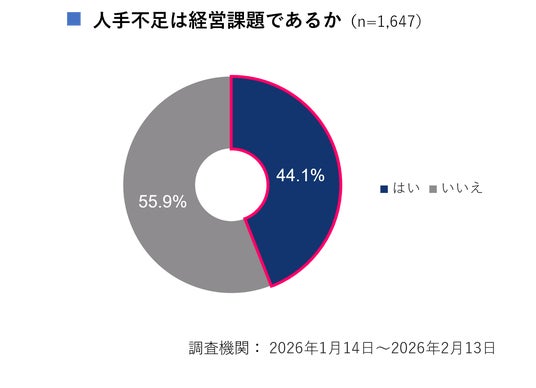 https://gdx-research.com/wp-content/uploads/2026/04/bluereport_202605.pdf■従業員規模が大きくなるほど人手不足を経営課題と感じる企業が多い・中小企業に対し、「人手不足は経営課題であるか」と聞いたところ、全体では44.1%が「はい」と回答しました。その結果を従業員規模別でみると、従業員数が0~9人の企業では「はい」と回答した企業は33.5%に留まる一方、50人以上の規模では80.3%に達し、その規模が大きくなるにつれて経営課題として認識する企業の割合も大きくなることがわかりました。