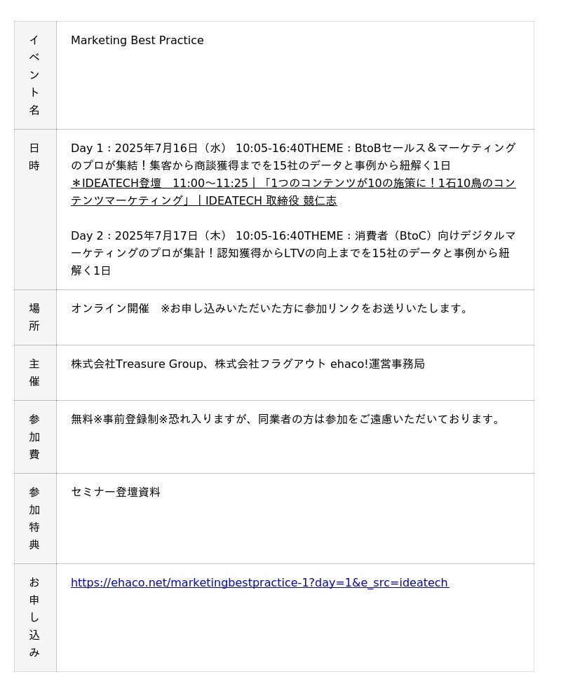 ファクトに基づいたコンテンツ開発とマーケティング支援を行う、株式会社IDEATECH(本社:東京都港区、代表取締役社長:石川友夫、以下 IDEATECH)は、株式会社フラグアウト(本社:東京都新宿区、代表取締役:梶原 正明)、株式会社Treasure Group(本社:東京都新宿区、代表取締役:吉田 誠)主催のセミナーイベント「Marketing Best Practice」に、2025年7月16日(水)に登壇致しますので、お知らせします。 IDEATECHからは、取締役の競仁志が11:00~11:25の枠で「1つのコンテンツが10の施策に!1石10鳥のコンテンツマーケティング」のタイトルの下、BtoBマーケティング上で有効なコンテンツ戦略について解説します。