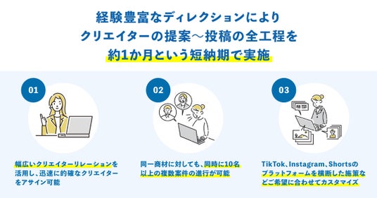 そこで、レジャー商材に特化した動画投稿を得意とするクリエイターのアサインから、構成案企画、SNSへの投稿と再生数を増加させる広告配信、レポーティングまでをセットで行うパッケージ商品の提供を開始いたしました。