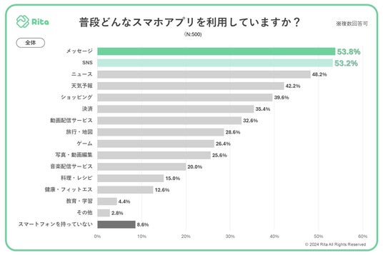 20代~60代の男女を対象に、「普段どんなスマホアプリを利用していますか?」というアンケートを実施したところ、最も多かった回答は「メッセージ」で53.8%でした。次いで、「SNS」が53.2%、「ニュース」が48.2%で続くという結果になりました。