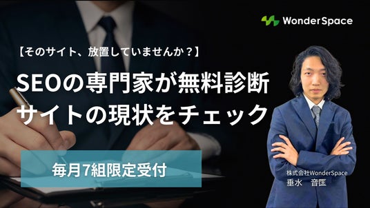 株式会社WonderSpace(本社:東京都港区、代表取締役社長:山本 尚宏)は、毎月7組限定でSEOの専門家がサイトの現状をチェックする無料診断を開始いたします。