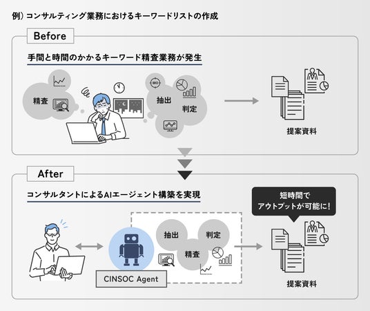 今回開発しているCINSOC Agentを利用することで、人の手を介していた以下のような過程を自動化するAIエージェントをコンサルタントが構築できるようになります。