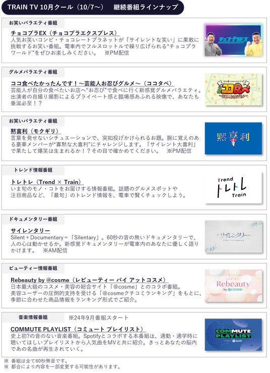 週にのべ8,400万人(jeki調べ)にのぼる乗客に番組コンテンツを届けるTRAIN TVは、開局より大きな反響をいただく中、秋クールにあたる24年10月7日(月)放映週よりTRAIN TV初となる大型改編を実施いたします。