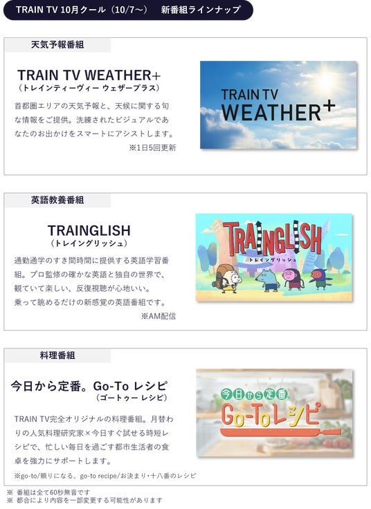 放映する番組の約半分を新番組に刷新、一部番組でのAM/PM配信を開始するTRAIN TVは、移動する生活者に寄り添う「新時代の生活密着メディア」として更なる進化を図ります。
