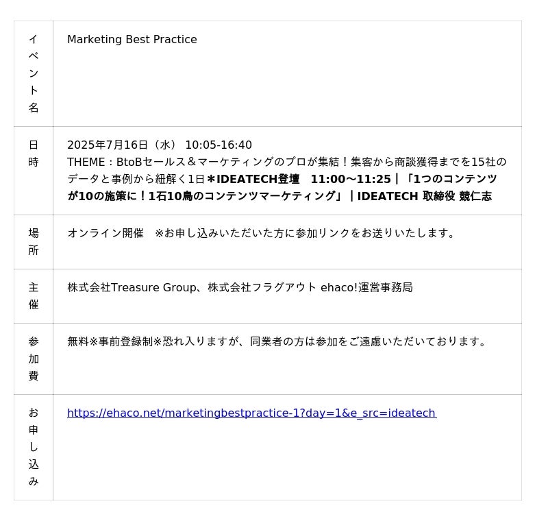 2025年7月16日(水)に開催されるセミナーイベント「Marketing Best Practice」に、株式会社IDEATECH 取締役の競仁志が登壇します。