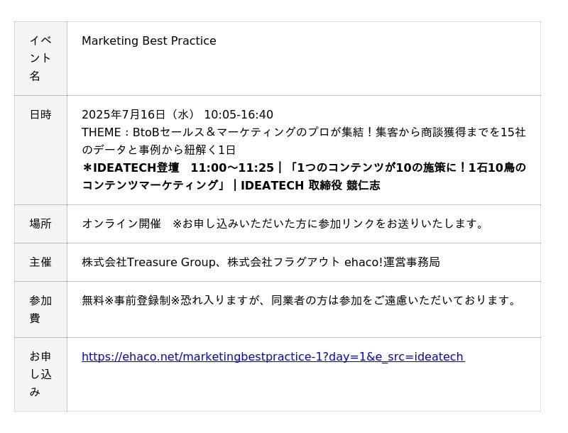 2025年7月16日(水)に開催されるセミナーイベント「Marketing Best Practice」に、株式会社IDEATECH 取締役の競仁志が登壇します。