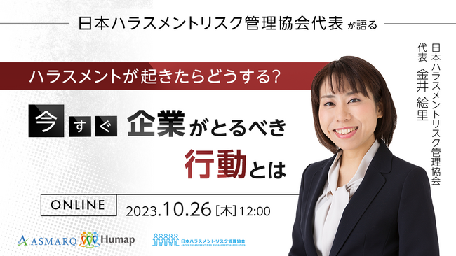 従業員総活躍サービス「Humap」を提供する株式会社アスマーク(東京都渋谷区東、代表取締役:町田正一)は、2023年10月26日(木)12:00に「ハラスメント」をテーマに、日本ハラスメントリスク管理協会 代表理事である金井様にご登壇いただきセミナーを開催いたします。