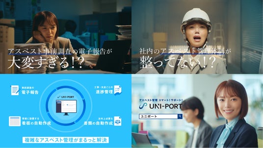 アスベスト対応工事に必要な書類作成現場を舞台に、俳優・立花のぞみを起用し、煩雑な法令対応書類の作成や看板の自動作成、電子マニフェスト機能などの課題を「UNI-PORT」が解決し、業務効率化や担当者の負担軽減につながるという、臨場感のあるシーンが描かれています。
