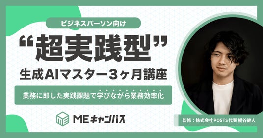 株式会社D1-Lab(本社:東京都港区、代表取締役:北 祐一、半澤 剛、株式会社Brave group100%子会社、以下「D1-Lab」)は、オンライン学習プラットフォーム「MEキャンパス」において、企業の社員研修や個人のスキルアップに最適な『MEキャンパス ビジネスパーソン向け“超実践型”生成AI活用マスター3ヶ月講座』を新設いたしました。