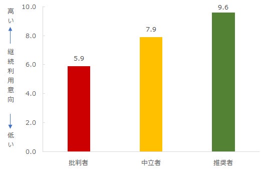 対象の電力会社において、今後の継続利用意向を0~10の11段階でたずねたところ、「推奨者」(推奨度が「9」~「10」の回答者)は平均9.6ポイント、「中立者」(推奨度が「7」~「8」の回答者)は平均7.9ポイント、「批判者」(推奨度が「0」~「6」の回答者)は平均5.9ポイントとなり、推奨度が高いほど継続利用意向も高くなる結果となりました。