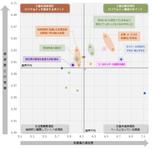 20の要因別に業界全体のロイヤルティの要因を分析したところ、「企業の信頼性/ブランドイメージ」や「サービスの信頼性/安定性」に加え、「自分にあった契約プランがあること」や「契約プランがシンプルで分かりやすいこと」がロイヤルティを醸成する要因となりました。また、「マイページなどの契約者専用ページの分かりやすさ・使いやすさ」や「コールセンターの応対の良さ」もNPS向上に寄与しました。