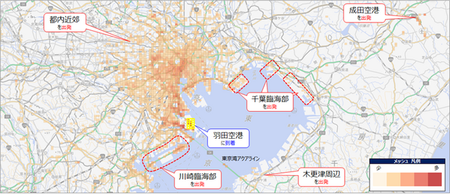 下図は羽田空港周辺を到着地にした自動車の出発地を500mメッシュ単位で分析したものです。都内近郊を中心に、近隣では東京湾アクアラインを利用しアクセスしやすい千葉県木更津市周辺、遠方では成田空港から出発した自動車も一定数存在することがわかります。その他、川崎市の臨海部や千葉県臨海部など、工場・物流施設が多く立地するエリアからの自動車も見られます。