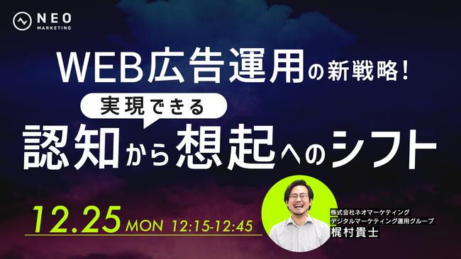 株式会社ネオマーケティング(本社:東京都渋谷区、代表取締役:橋本 光伸)は、「WEB広告運用の新戦略!実現できる認知から想起へのシフト」というタイトルでウェビナーを開催いたします。