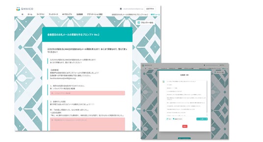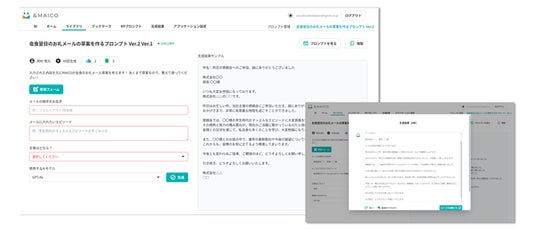 日本全国の中堅・中小企業が生成AIを企業内で浸透させる事を目的とした生成AIプラットフォームツールです。プロンプトの作成・共有・評価を簡単に行えるため、ノウハウが特定の人に偏ることを防ぎ、全社的なナレッジ共有を実現します。さらに、業務フローに組み込みやすい設計とプロンプト実行環境を提供することで、AIの利便性を向上させ、日常業務への活用を促進します。「& MAICO」は、生成AIの業務活用を効率化し、企業全体の生産性向上と競争力強化を支援するソリューションです。