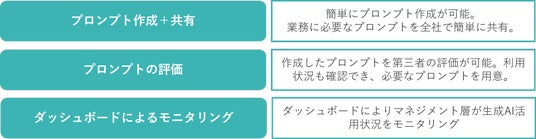 生成AIの社内プラットフォームとして主に3つの機能カテゴリを搭載しており、社内浸透/活用を実現します。