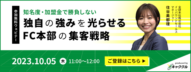 Zenken株式会社(本社:東京都新宿区、代表取締役社長:林 順之亮、以下「Zenken」)は、10月5日(木)11時より無料オンラインセミナーを開催します。「知名度・加盟金で勝負しない 独自の強みを光らせるFC本部の集客戦略」と題し、フランチャイズ・ビジネスの加盟店を増やすためのWeb集客の手法などを解説します。