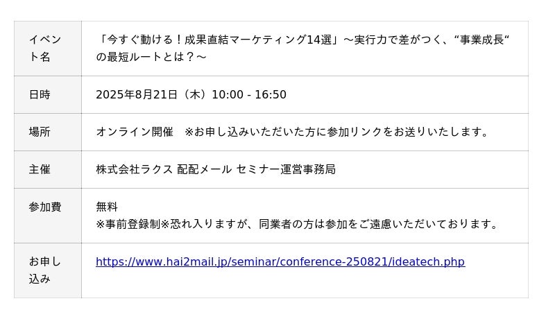2025年 8月21日(木)に開催されるセミナーイベント「今すぐ動ける!成果直結マーケティング14選」~ 実行力で差がつく、“事業成長“の最短ルートとは? ~」に、株式会社IDEATECH 取締役の競仁志が登壇します。本セミナーでは、市場の声・顧客の声を武器に受注を生み出す「リサーチデータマーケティング」について解説いたします。