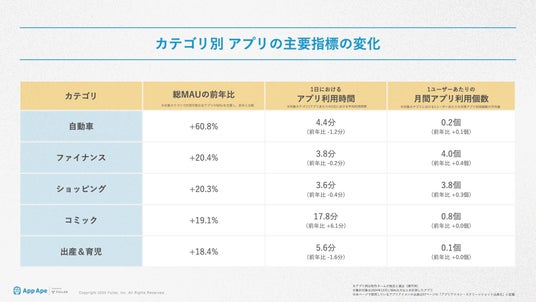 カテゴリ別にアプリ総MAUの増加率が高いカテゴリを見ると、「自動車」の成長が特に顕著でした。対象カテゴリ1アプリあたりの1日における平均利用時間を見ると、「コミック」は前年比+6.1分と大幅に増加しました。