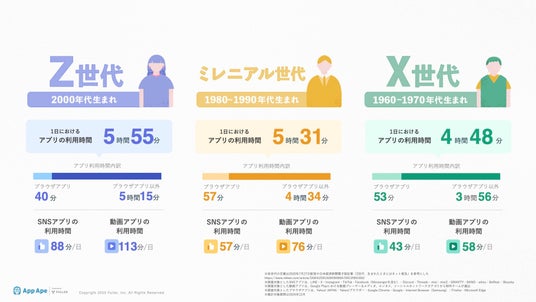 アプリユーザーを「Z世代(2000年代生まれ)・ミレニアル世代(1980年~90年代生まれ)・X世代(1960年~1970年代生まれ)」の3世代に区分。1日におけるアプリの利用時間・SNSアプリの利用時間・動画アプリの利用時間の3つの指標について取りまとめ、世代間の差異を比較しました。