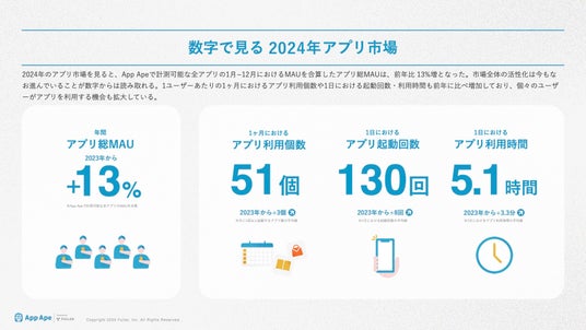 2024年のアプリ市場を見ると、App Apeで計測可能な全アプリの1月~12月におけるMAUを合算したアプリ総MAU(月間アクティブユーザー数)は前年比で13%増加しました。1ユーザーあたりの1ヶ月におけるアプリ利用個数は前年比3個増の51個、1日におけるアプリ利用時間は3.3分増の5.1時間でした。