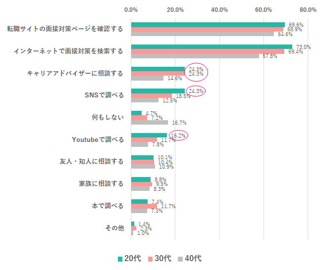 年代別で見ても結果に大差はありませんでしたが、「キャリアアドバイザーに相談する」「SNSで調べる」「Youtubeで調べる」は若い年代ほど高い回答率となっており、20代と40代で比較すると、「SNSで調べる」「Youtubeで調べる」は約2倍の差があることがわかりました。