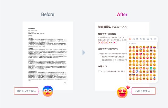 大人数の会議や発言が難しい状況でも、議事録上でのリアクションを用いて、簡単に意思表示を行うことが可能です。