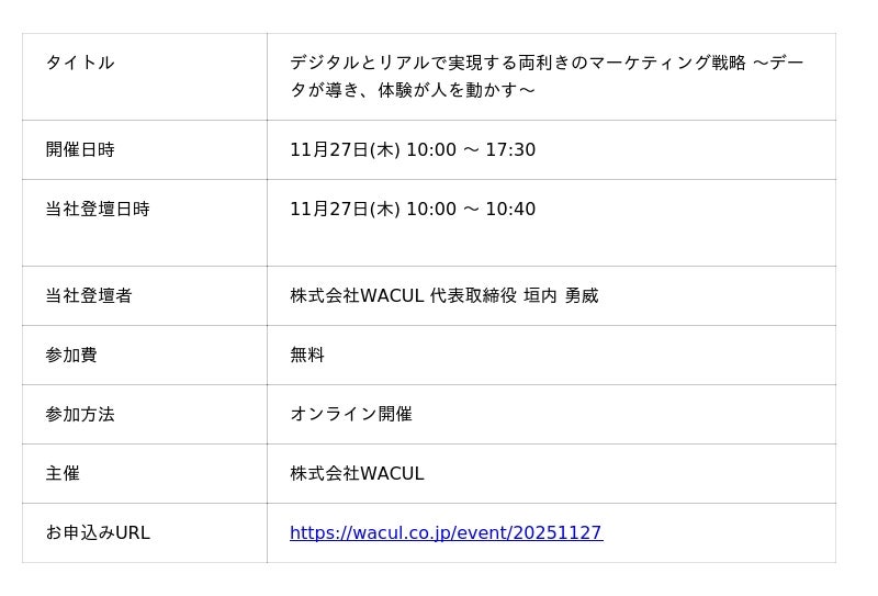 株式会社WACUL2025年11月27日開催のカンファレンス「デジタルとリアルで実現する両利きのマーケティング戦略 ~データが導き、体験が人を動かす~」を株式会社WACULが開催いたします。