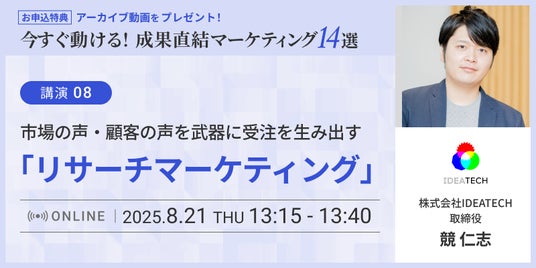 2025年 8月21日(木)に開催されるセミナーイベント「今すぐ動ける!成果直結マーケティング14選」~ 実行力で差がつく、“事業成長“の最短ルートとは? ~」に、株式会社IDEATECH 取締役の競仁志が登壇します。本セミナーでは、市場の声・顧客の声を武器に受注を生み出す「リサーチデータマーケティング」について解説いたします。