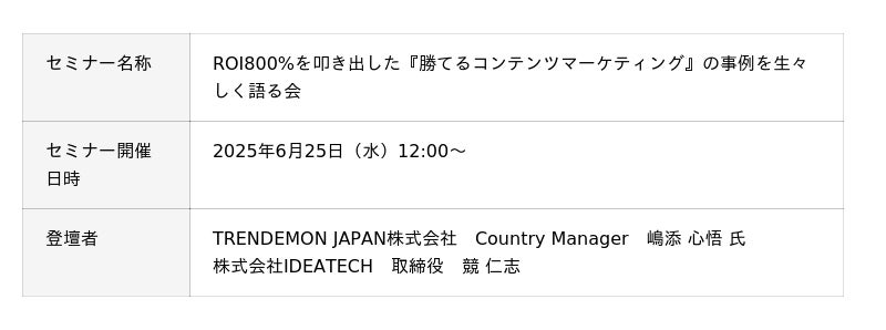 コンテンツPR・コンテンツマーケティング・コンテンツセールスを総合支援する株式会社IDEATECH(本社:東京都港区、代表取締役社長:石川友夫)と、ABM支援ツールを提供するTRENDEMON JAPAN株式会社(本社:東京都港区、代表:Halel Porat)は、2025年6月25日に共催セミナー「ROI800%を叩き出した『勝てるコンテンツマーケティング』の事例を生々しく語る会」を開催しました。 本セミナーでは、両社が共同で実施したABMコンテンツマーケティング施策の詳細と、その背景・成果・成功要因を余すところなく紹介。参加者からは「すぐに自社施策に取り入れたい」「ABM推進のヒントが得られた」といった声が多数寄せられました。