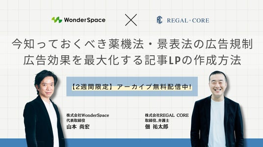 株式会社WonderSpace(本社:東京都港区、代表取締役社長:山本 尚宏)は、株式会社REGAL CORE(本社:東京都渋谷区、代表取締役:田之上 隼人)と『今知っておくべき薬機法・景表法の広告規制&広告効果を最大化する記事LPの作成方法』をテーマにした共催ウェビナーのアーカイブ配信を本日から2週間限定「1月6日(月)~1月17日(金) 」で公開いたします。