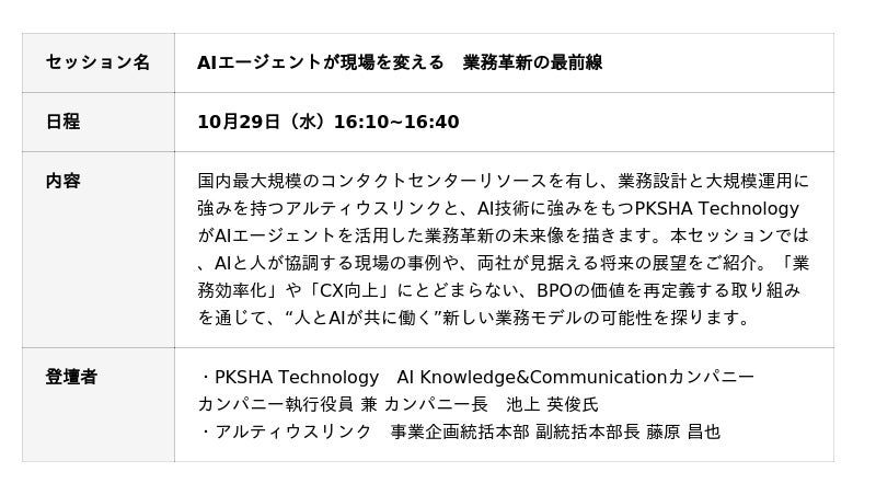 登壇セッション「AIエージェントが現場を変える 業務革新の最前線」では、国内最大規模のコンタクトセンターリソースを有し、業務設計と大規模運用に強みを持つアルティウスリンクと、AI技術に強みをもつPKSHA Technologyが、生成AIの活用状況からAIエージェント導入の課題、業務における活用事例など、利用シーンを交え実践的な視点でご紹介します。また、両社で取り組む、バックオフィスBPO領域での共同AIソリューションの展望についてもお伝えします。