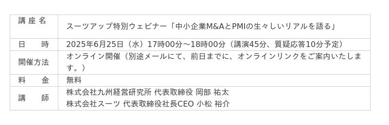 株式会社スーツ(所在地:東京都千代田区、代表取締役社長CEO:小松 裕介)は、2025年6月25日(水)17時から、ゲスト講師に、株式会社九州経営研究所 代表取締役 岡部 祐太氏を迎え、第11回となるスーツアップ特別ウェビナー「中小企業M&AとPMIの生々しいリアルを語る」を無料開催します。