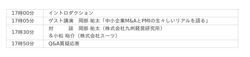 1.スーツアップ特別ウェビナー「中小企業M&AとPMIの生々しいリアルを語る」概要当社では、6月25日(水)17時から、ゲスト講師に、株式会社九州経営研究所 代表取締役 岡部 祐太氏を迎え、第11回目となるスーツアップ特別ウェビナー「中小企業M&AとPMIの生々しいリアルを語る」を無料開催します。