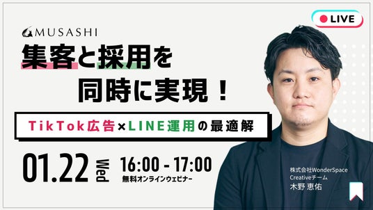 株式会社WonderSpace(本社:東京都港区、代表取締役社長:山本 尚宏)は、『【集客と採用を同時に実現!】TikTok広告×LINE運用の最適解』をテーマにウェビナーを開催します。