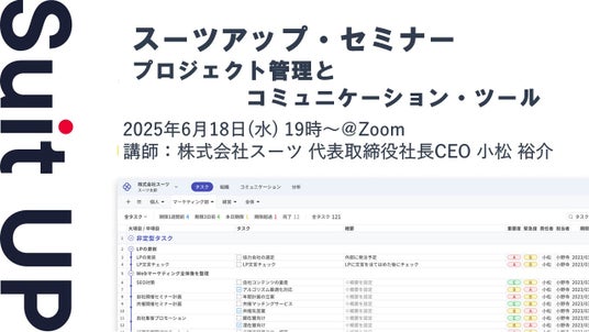 株式会社スーツ(所在地:東京都千代田区、代表取締役社長CEO:小松 裕介)は、2025年6月18日(水)19時から、当社代表の小松が講師を務めるスーツアップ・セミナー「プロジェクト管理とコミュニケーション・ツール」を無料開催します。