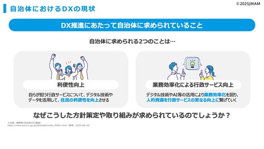 行政分野では、住民サービスの高度化や業務効率化が求められる一方、「自治体ビジネスに関わる部門で、行政分野のDX動向を体系的に学ぶ機会がない」という課題があります。