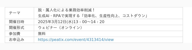 【3/12無料共催ウェビナー】生成AI・RPAを活用した業務効率化、生産性向上、コストダウンを解説
