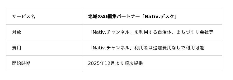 地域情報プラットフォーム「まいぷれ」を運営し、地域活性化ソリューションを提供する株式会社フューチャーリンクネットワーク(本社:千葉県船橋市、代表取締役:石井丈晴、以下FLN)と、その子会社である地域活性AIテクノロジーズ株式会社(本社:千葉県船橋市、代表取締役:佐宗勇志)は、地方移住・関係人口創出のプラットフォーム「Nativ.media(ネイティブ.メディア)」専用の記事作成支援AIツール「Nativ.デスク」を、2025年12月より順次提供開始いたします。