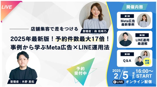 株式会社WonderSpace(本社:東京都港区、代表取締役社長:山本 尚宏)は、ソルー株式会社(本社:東京都台東区、代表取締役:下地 麻大)と『【店舗集客で差をつける】2025年最新版!予約件数最大17倍!事例から学ぶMeta広告×LINE運用法』をテーマにした共催ウェビナーを開催します。