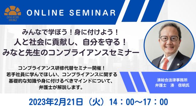 法律関連出版物、各種データベースを提供する第一法規株式会社(所在地:東京都港区、代表取締役社長:田中 英弥)は『みんなで学ぼう!身に付けよう!人と社会に貢献し、自分を守る!みなと先生のコンプライアンスセミナー』を2023年2月21日に開催いたします。