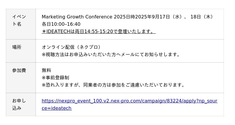 ファクトに基づいたコンテンツ開発とマーケティング支援を行う、株式会社IDEATECH(本社:東京都港区、代表取締役社長:石川友夫、以下 IDEATECH)は、株式会社ネクプロ(本社:東京都千代田区、代表取締役:山田泰生)が主催するカンファレンス「Marketing Growth conference 2025」に、2025年9月17日(水)・18日(木)の2日間において登壇します。