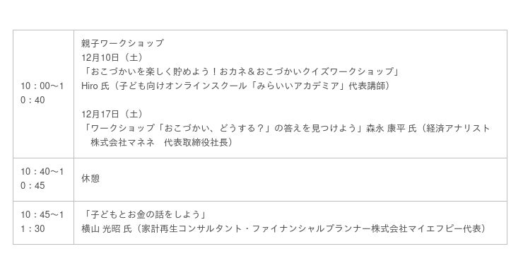 「親子で学ぼう!『おこづかい』から考えるお金のこと」 内容および出演者(予定)